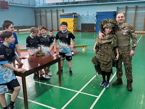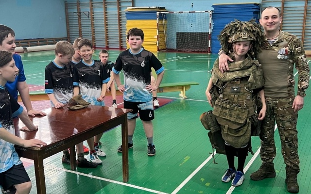 Воин-десантник показал образцы военного снаряжения, которое мальчишки немедля поспешили примерить, терпеливо отвечал на вопросы.