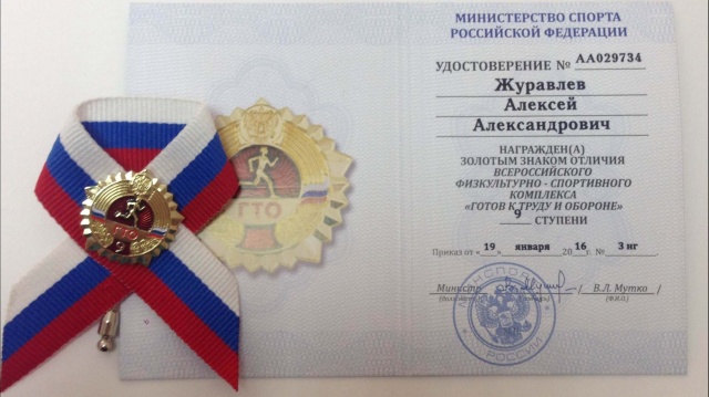 Золотой знак ГТО Алексея Журавлева