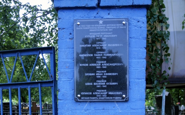 В 1942 г. на территории с.п.Верейское действовал госпиталь. В нем, как и во многих других, от ран умирали те, кто шел на смертный бой, защищая свою Родину. Так, в 2013 г. Илья выяснил, что на территории старого Верейского кладбища находились воинские захоронения. На сегодняшний день удалось найти только одну могилу, за которой ухаживают родственники погибшего солдата. Остальных, увы, нет. Но это не значит, что люди должны уйти в вечность без памяти. Младший лейтенант Петр Иванович Купцов, сержант Павел Поликарпович Филиппов, рядовые Алексей Александрович Жуков, Иван Ефимович Злобин, Василий Кузьмич Шваб, Александр Иванович Юпиков скончались в эвакуационном госпитале в 1942 г. Самому младшему из них было всего 19 лет, самому старшему - 46… Теперь у входа в сельское кладбище висит доска, где увековечены имена смелых, сильных духом, мужественных людей, не доживших до нынешних дней, но защищавших страну-победительницу.