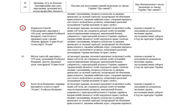 Украинские санкции введены в отношении председателя партии "РОДИНА", депутата Госдумы России Алексея Журавлёва и главы Исполкома, руководителя Рабочей группы партии "РОДИНА" на Донбассе Евгения Ивлева. Им запрещён въезд на территорию этой страны.