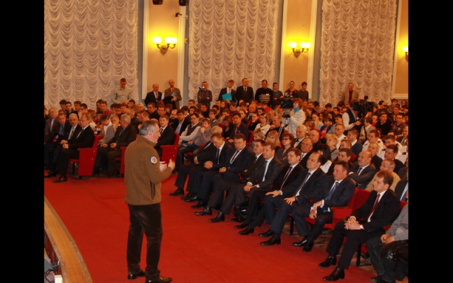 Члены партии "РОДИНА" в Челябинской области во главе со своим лидером Фёдором Юриным слушали основателя своей партии в первых рядах.