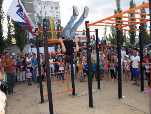 На открытии площадки члены керченского Griffon workout club устроили настоящее шоу, показав зрителям всю прелесть этого относительно нового вида спорта. Кроме того, перед посетителями выступили танцевальные коллективы Щелкино и Феодосии. А кульминацией спортивного праздника стал баттл брейкдансеров.
