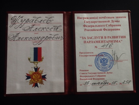 Решением Совета Государственной думы председатель партии "РОДИНА", член Комитета Госдумы по обороне Алексей Журавлёв награждён почётным знаком Государственной Думы "За заслуги в развитии парламентаризма".