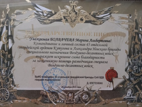 Командование и личный состав 45 отдельной гвардейской орденов Кутузова и Александра Невского бригады специального назначения Воздушно-десантных войск выражает искреннюю благодарность за неоценимую помощь разведчикам спецназа ВДВ Марине Альбертовне Болвачевой, депутату Собрания депутатов муниципального образования город Липки Киреевского района Тульской области от партии "РОДИНА".
