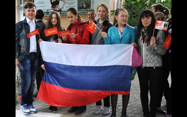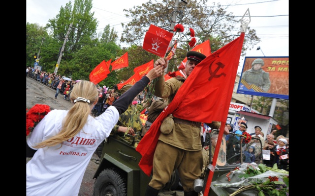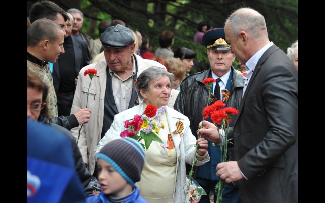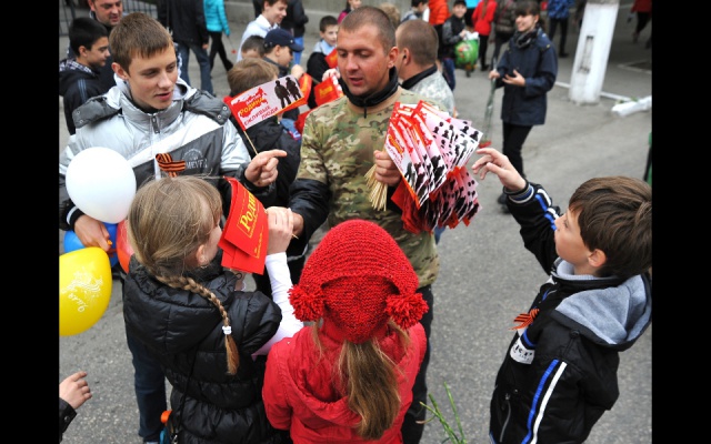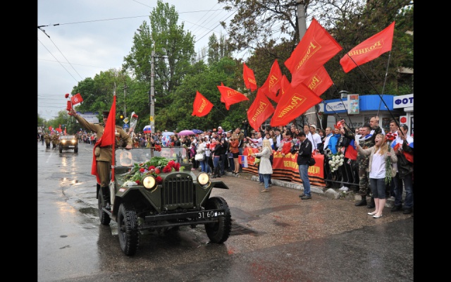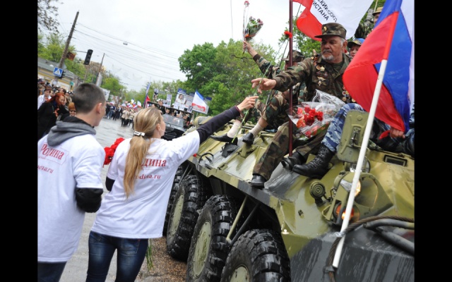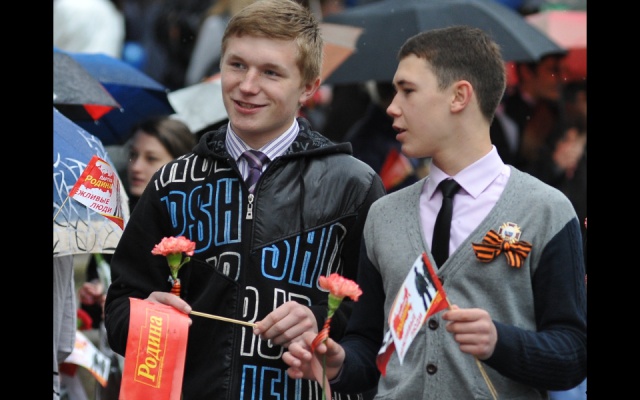 Молодые ребята поздравляли всех симферопольцев с Днем Победы, вручали флажки с уже узнаваемыми всеми крымчанами "вежливыми людьми" и георгиевские ленточки, а ветеранам вместе со словами благодарности дарили красные гвоздики. После акции партийная колона родинцев приняла участие в шествии к мемориалу "Могила неизвестного солдата". Там ребята возложили цветы на Аллею славы и к Вечному огню, почтили минутой молчания память погибших героев, которые 70 лет назад освободили нашу Родину - Крым - от фашизма.