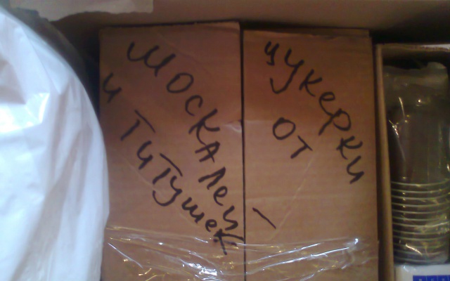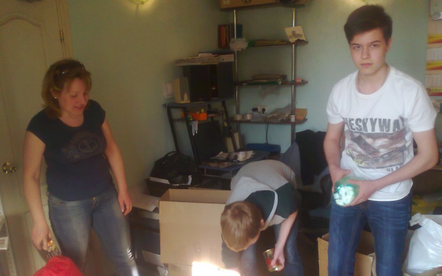 Люди приносят на пункт сбора вещи, продукты питания, лекарства и другие средства. Многие жертвователи кладут в коробки с вещами письма, в которых передают жителям Донецкой республики слова поддержки. На сегодняшний момент собрано около десяти кубов гуманитарного груза.