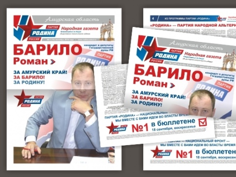Первая полоса номера призывает на приближающихся выборах голосовать за кандидата в депутаты Государственной думы от партии "РОДИНА" Романа Барило, последующее содержание газеты разъясняет — почему.