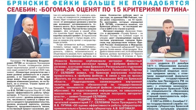 На второй полосе - комментарий главы Брянской "РОДИНЫ» " Указа Президента РФ об утверждении критериев оценки работы губернаторов: "Брянские фейки больше не понадобятся. Селебин: Богомаза оценят по 15 критериям Путина".