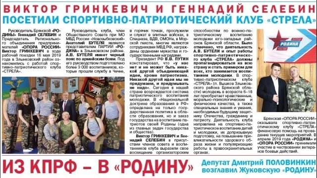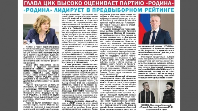 В газете также публикуется материал о встрече в п. Вышков Злынковского района Виктора Гринкевича и Геннадия Селебина с Анатолием Бутелей - руководителем спортивно-патриотического клуба "Стрела", представителем партии "РОДИНА" в Злынковском районе и статья "Из КПРФ - в "РОДИНУ" (о назначении депутата Жуковского городского Совета Дмитрия Половинкина руководителем представительства партии "РОДИНА" в Жуковском районе).