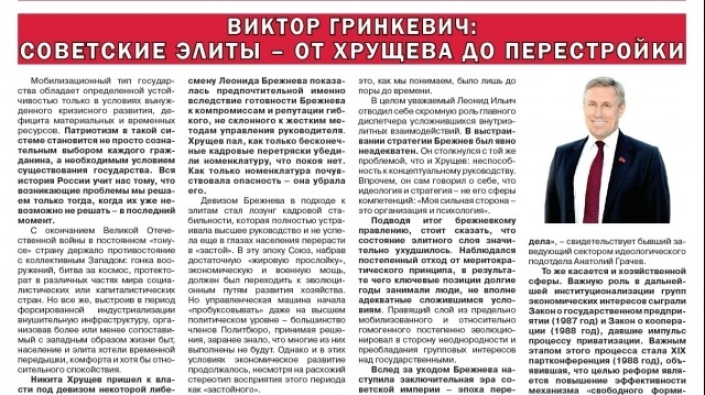 На третьей полосе - заслуживающая особого внимания читателей статья Виктора Гринкевича "Советские элиты – от Хрущева до перестройки".