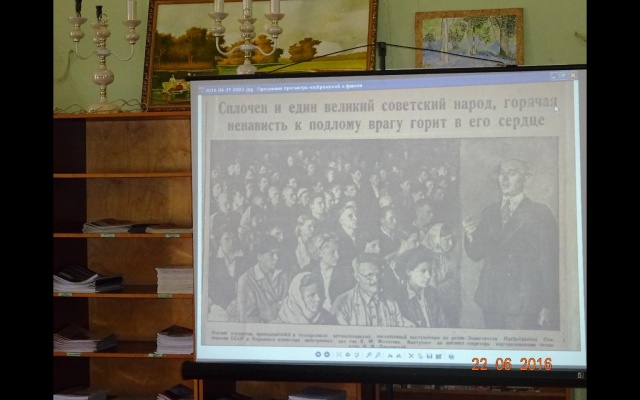 Торжественные мероприятия начались в читальном зале. Организаторы акции: отдел "Юность", информационно-библиографический отдел, центр краеведческой и муниципальной информации, подготовили для читателей – участников акции литературно-патриотическую композицию "Вставай, страна огромная".