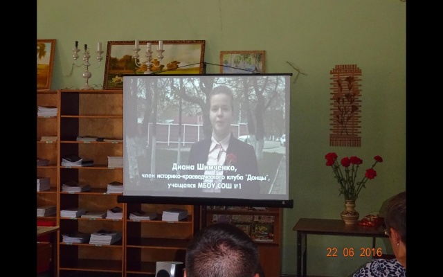 Члены историко-краеведческого клуба "Донцы» совершили экскурс в историю и познакомили зрителей с заметками, которые были напечатаны в первые дни войны, на страницах городской газеты "Знамя коммуны". Литературно-патриотическая композиция завершилась показом фильма, снятого к 70-летию Победы участниками клуба. При его подготовке были использованы подлинные документы начала войны и кадры военной хроники.