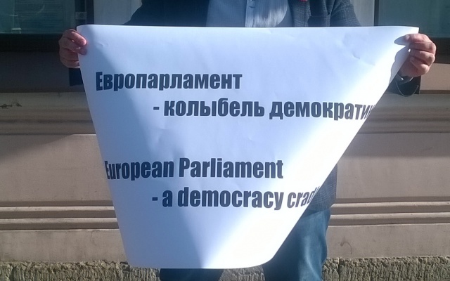 Участники пикетов вышли к консульствам стран Европы, выражая свой протест против двойных стандартов в Европарламенте, держа в руках плакаты с надписями: Европарламент - только для геев? (European Parliament - only for gays?), Европарламент - только для украинских националистов? ( European Parliament - only for the Ukrainian nationalists?), Европарламент - аватар НАТО? (European Parliament - an avatar of NATO?), Европарламент - против свободы слова? (European Parliament - against a freedom of speech?),Европарламент - колыбель демократии? (European Parliament - a democracy cradle?), Европарламент - публичный дом? (European Parliament - a public house?).