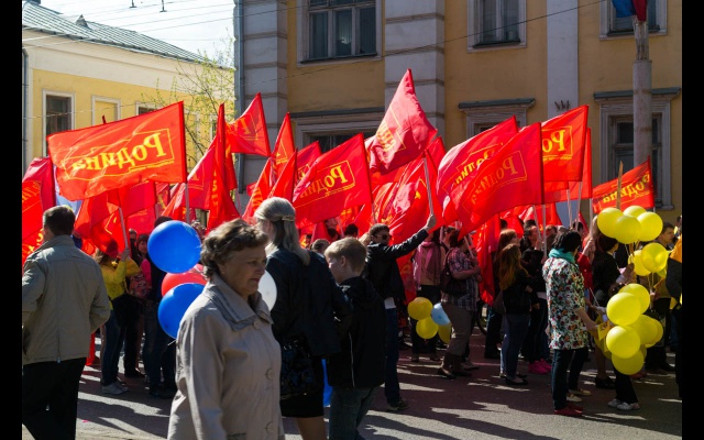 Активисты партии "РОДИНА" вышли на первомайскую демонстрацию с флагами и партийной атрибутикой.