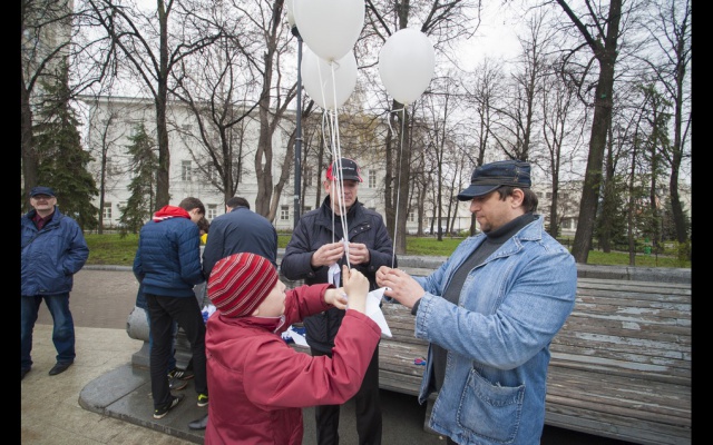 Участники, люди разных возрастов, большинство, конечно, студентов, сложили из бумаги белых голубей, по технике оригами. Тех, кто делал это впервые научили более опытные участники. Затем каждого "голубя мира" привязали к белому воздушному шару. Выстроившись в слово "мир", в едином порыве под дружный хор "Мы - за мир на Украине!" участники "запустили" в небо своих "голубей". К слову, в акции принимали участие и просто случайные прохожие-гости из Москвы, заинтересовавшиеся действом и поддержавшие идею мира на Украине.