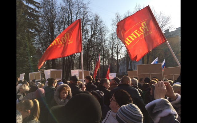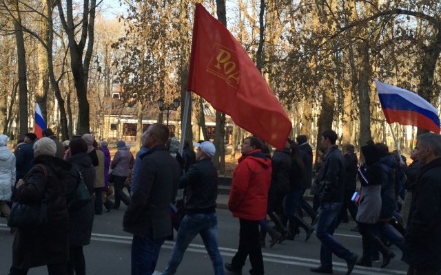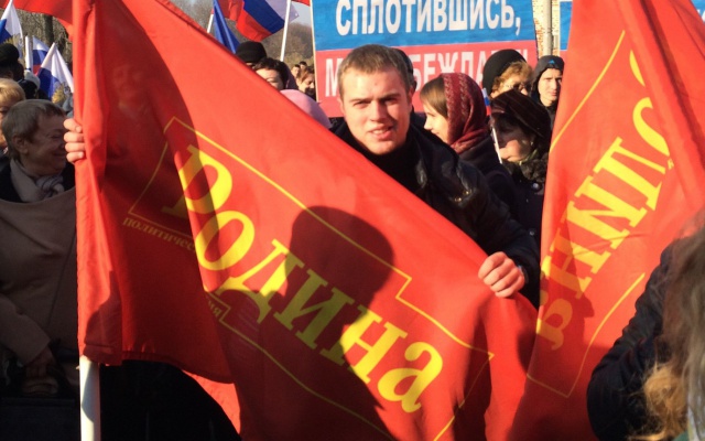 Соратники партии "РОДИНА" прошли по городу с партийной символикой.