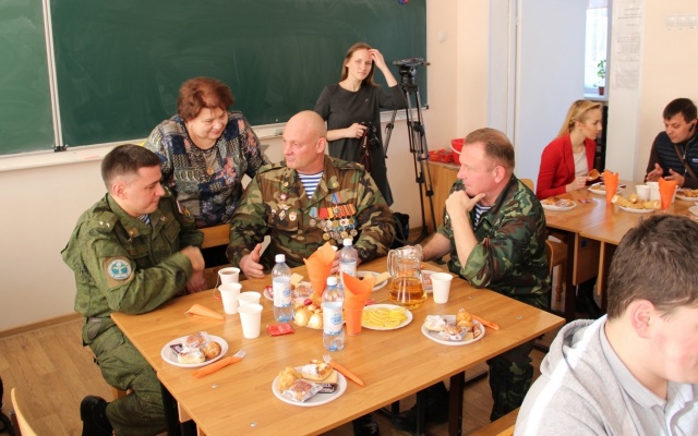 Урок мужества проходил в школьном музее "Возрождение", который с трудом вмещал всех желающих. Представители Самарского регионального отделения партии "РОДИНА" рассказали старшеклассникам о том, каким стало теперь Рязанское гвардейское высшее воздушно-десантное ордена Суворова дважды Краснознамённое командное училище имени генерала армии В.Ф. Маргелова, о боевых спецоперациях и мирных буднях ВДВ, о выпускниках училища, ставших героями, и еще о многом другом. Ветераны спецназа ответили на интересующие ребят вопросы и, под аккомпанемент баяна, исполнили песни о ВДВ и о родном для всех десантников училище. Потом в одном из школьных классов было сладкое чаепитие, которое тоже не обошлось без песен.