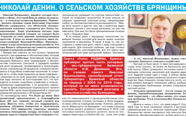 Очередное интервью Н.В. Денина газете «Голос РОДИНЫ. Брянск» - это своеобразный отчет Губернатора Брянской области за период с 2004 по 2014 годы, который он не имел возможности сделать. Сегодняшний разговор о сельском хозяйстве Брянщины.