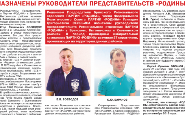 На четвертой полосе рассказывается о назначении руководителей представительств партии "РОДИНА" в Брянском, Выгоничском и Клетнянском районах Е.В. Воеводова и С.Ю. Баранова.