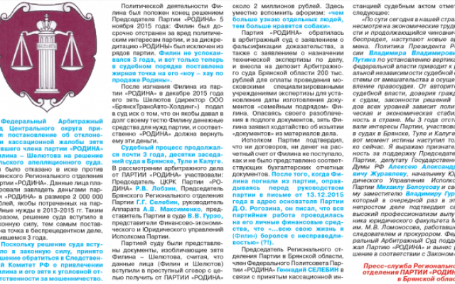 В подвале 4 полосы - о решении Федерального Арбитражного суда, который поставил жирную точку на «ноу-хау Филина-Шелютова по продаже Родины».